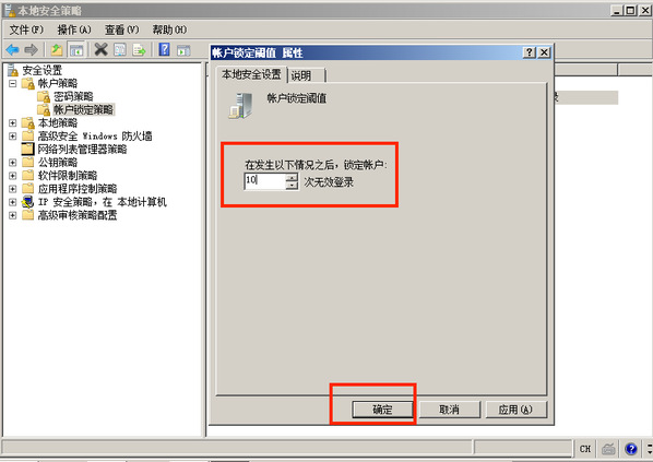 打开 控制面板 > 管理工具 > 本地安全策略,在 帐户策略 > 帐户锁定策略 中,配置 帐户锁定阈值 不大于10次。 配置样例: