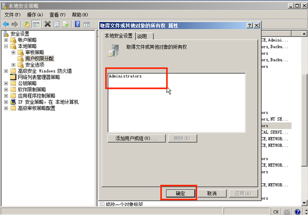 在本地安全设置中,取得文件或其它对象的所有权权限只分配给 Administrators 组。