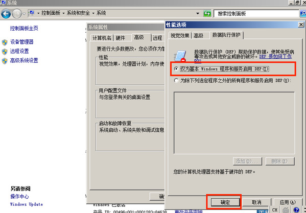 对 Windows 操作系统程序和服务启用系统自带 DEP 功能(数据执行保护),防止在受保护内存位置运行有害代码 操作步骤 进入“控制面板->系统”,在“高级”选项卡的 “性能”下的“设置”。进入 “数据执行保护”选项卡。设置为“ 仅为基本 Windows 操作系统程序和服务启用 DEP ”。