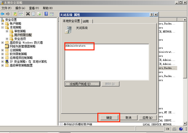 在本地安全设置中,从远端系统强制关机权限只分配给 Administrators 组。