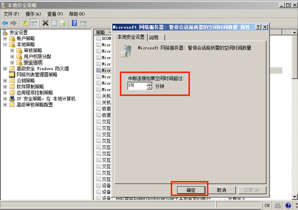 打开 控制面板 > 管理工具 > 本地安全策略,在 本地策略 > 安全选项 中,设置 Microsoft 网络服务器:暂停会话前所需的空闲时间数量 属性为 15 分钟。