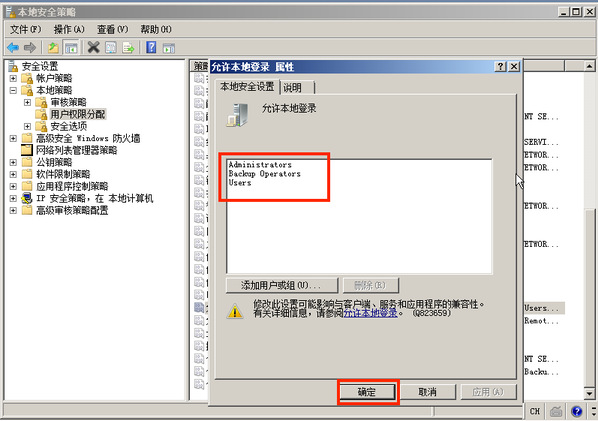 在本地安全设置中,配置指定授权用户允许本地登陆此计算机。