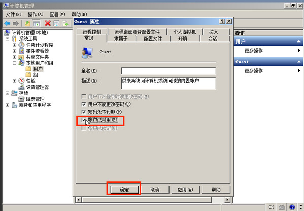 打开 控制面板 > 管理工具 > 计算机管理,在 系统工具 > 本地用户和组 > 用户 中,双击 Guest 帐户,在属性中选中 帐户已禁用,单击 确定。
