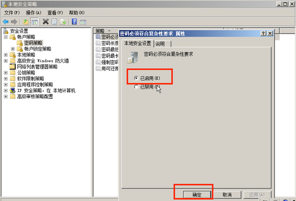 2.启用本机组策略中密码必须符合复杂性要求的策略。