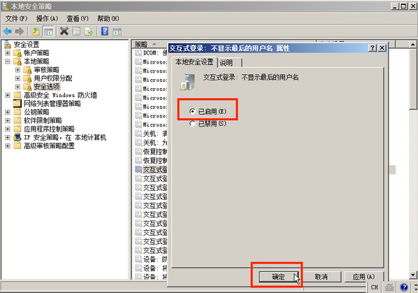 打开 控制面板 > 管理工具 > 本地安全策略,在 本地策略 > 安全选项 中,进行如下设置: